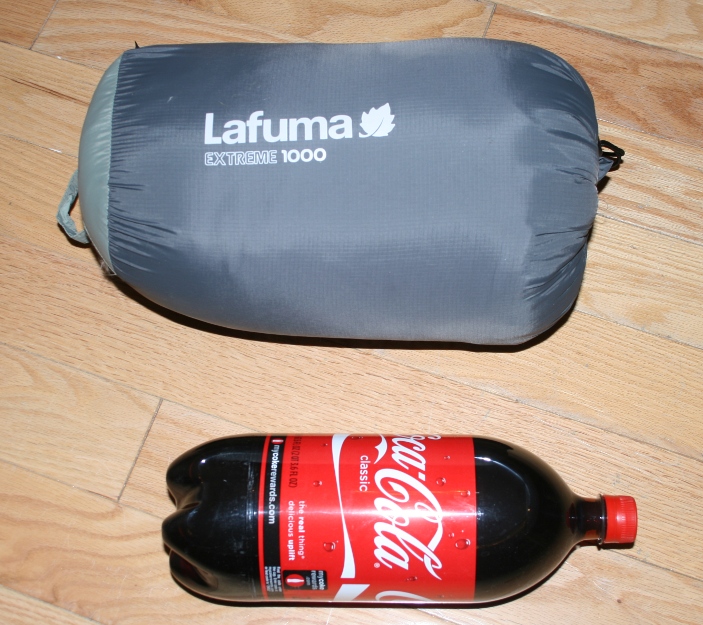 Now, I’m the pround owner of a Lafuma EXTREME 1000 ! Awesome name, but I’m still trying to figure out what’s extreme about a 30°F sleeping bag for girls. Unless it’s the fact that this bundle of snuggles can be squeezed down to less than a third of a bushel and weighs less than 2.5lbs! It’s comparable in size to a common two liter bottle and sizes up to my bike rack perfectly. Getting the bag and the soon-to-be-discussed hammock on top of the rack at the same time will be a bit challenging, but at least falls in the realm of possible!