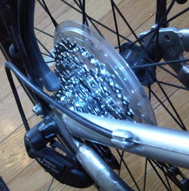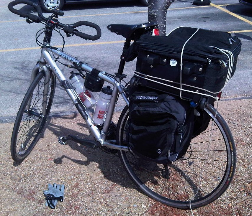23 hours ago I woke up in Londonderry, NH at 2am and suited up to ride my bicycle. My intermittent reliance on the bicycle as a primary means of transportation has continued for a couple extra unexpected days. Reduced mobility left me with extra down time at home and I rewarded my bicycle for its efforts with the maintenance promised in my previous post. In the photo here, the installed replacement cassette and chain illustrate textbook shiny newness. Overall, swapping these components was a quick job. Shifts are a bit snappier and there’s noticeably less play in the pedal stroke.Wasting no time putting my handiwork to the test, my challenge for the weekend was to deliver myself and a week’s worth of luggage the 12+ miles to work to catch a 4am airport shuttle. Benefiting again from seasonally advanced warmth, I opted two trips, a daytime one to deliver the bulk of my luggage and the early morning one for the primary purpose of delivering myself. The first truly warm saturday of the spring brought out many lightweight road bikers on the winding rural roads of Londonderry and I couldn’t help but laugh at my own image grinding through town with a suitcase tied to my rack. :) Truth be told, it was a very pleasant ride. I enjoyed the luxury of comfortable riding in my short sleeved jersey at least as much my streamlined comrades. Further, the 2am ride in reminded me of the great peace in rural summer nighttime riding.